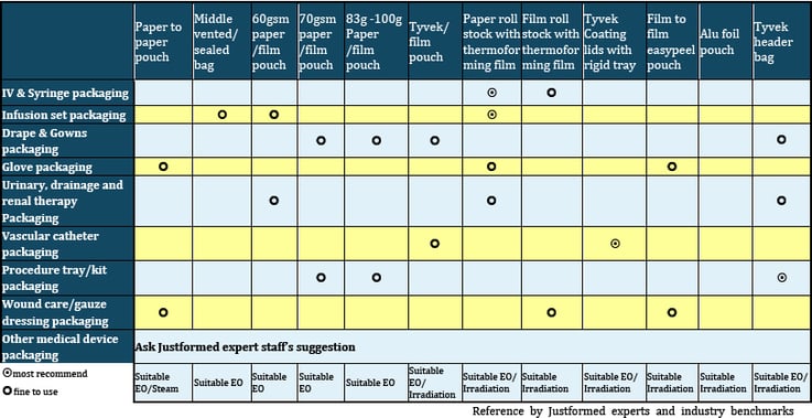 With simulation of customers’ physical applications, there are types of packaging forms to be used in current medical devices’ packagings. We elaborate below suggestive matrix to provide a consideration of your packagings.